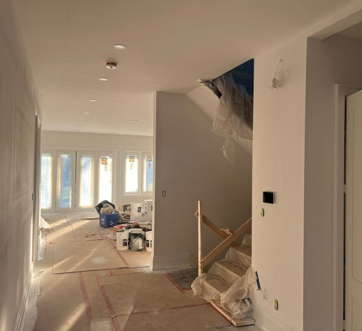 Insulated above-grade walls with R22 batts and applied continuous 6-mil poly vapour barrier across walls and attic ceilings. Spray-foamed rim joists, basement foundation walls and garage ceiling; blew R60 loose-fill into attic. Installed drywall throughout, taped and sanded to flawless Level 4, then primed all surfaces. Flush-mounted Aria vents with invisible seams and finished all windows and exterior doors with crisp drywall returns for a sleek, modern trimless look.